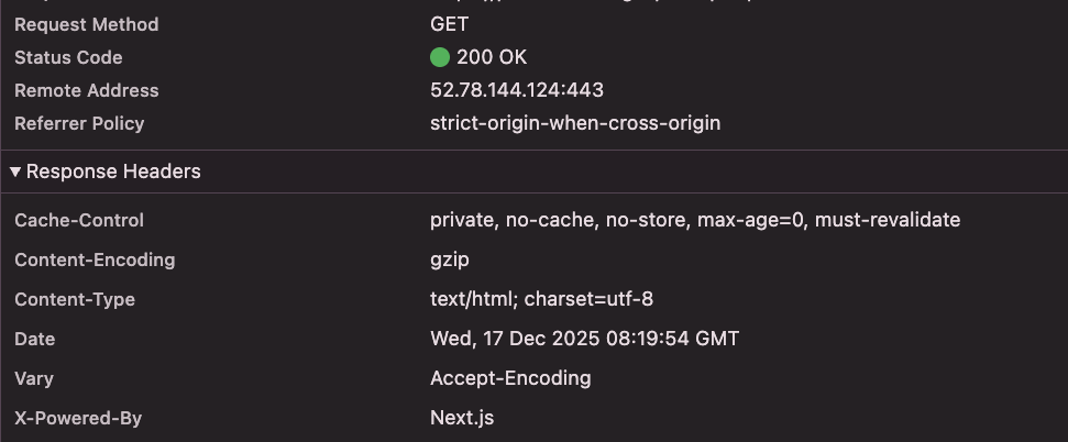 아래는 nextjs 애플리케이션의 index.html 요청입니다. 항상 서버로 부터 새로운 요청을 하기 위해 캐시가 되지 않습니다.