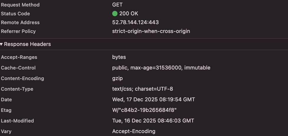 | JS/CSS | 해시 포함 + 1년 캐시 |