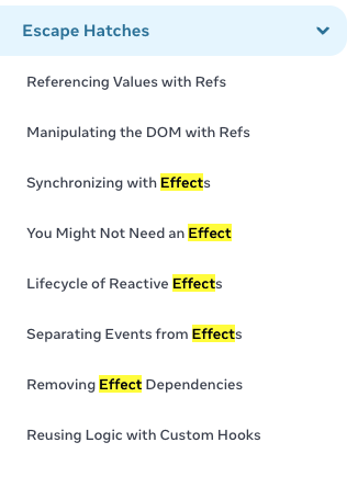 리액트 공식 문서의 Escape Hatches메뉴에 5가지의 effect에 대한 문서가 있습니다.