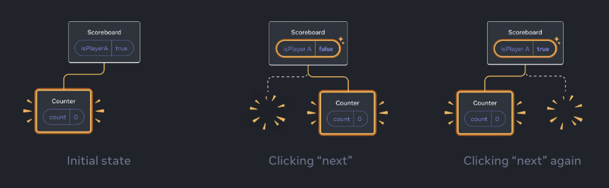 컴포넌트에서 사용되는 상태는 컴포넌트 내부에 귀속되는 것이 아닌 리액트 인스턴스가 관리합니다. 리액트는 컴포넌트 UI트리에 있는 위치를 이용해 리액트 인스턴스가 가지고 있는 각 상태를 렌더된 컴포넌트와 연결합니다.