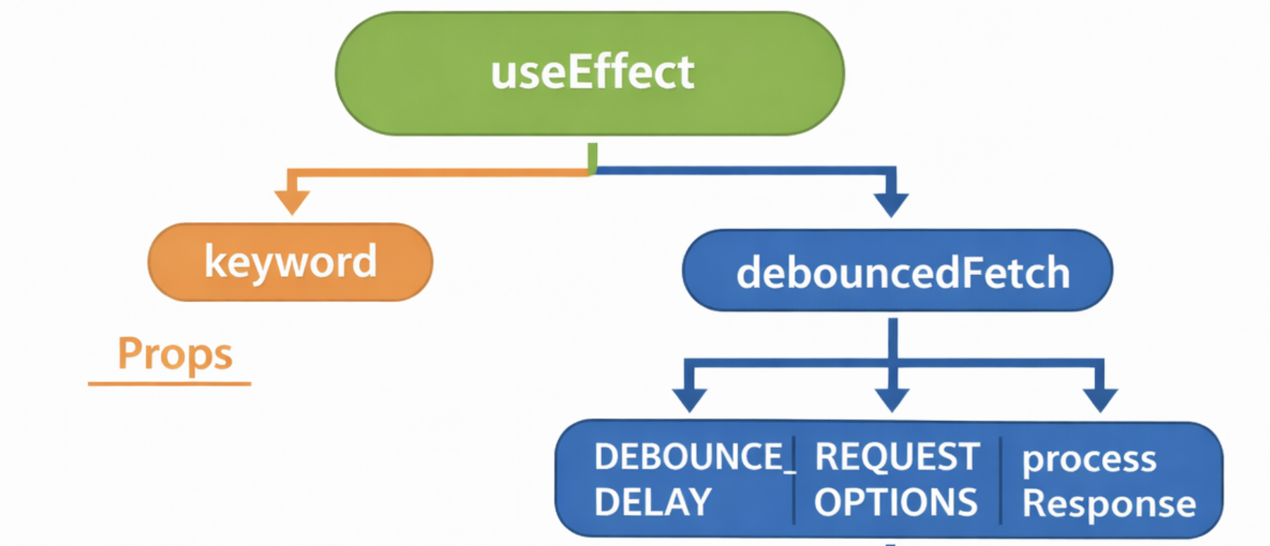 의존 관계를 평탄화해보면 useEffect는 DEBOUNCE_DELAY, REQUEST_OPTIONS, processResponse, keyword에 의존하고 있고 이 4가지 의존성중 한 가지만 변경되어도 effect함수가 실행됩니다.