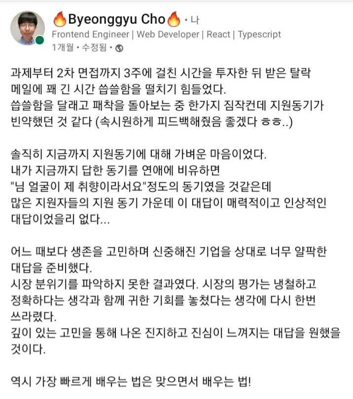 이번 구직은 저의 오만함에 대한 반성의 시간이었습니다. 부족한 부분에 대해서 많이 알게됐구요. 냉혹한 시장 결정에 여러 번 두들겨 맞은 지금은 저와 만나기 위해 시간을 내어 면접 기회를 주신 분들께 감사한 마음을 가지게 됐습니다.(소중한 면접 기회 주셔서 감사합니다!) 지나고 보면 은연중 드러났던 거만한 태도 때문에 많은 기회를 놓쳤다고 생각합니다. 지금 까지 커리어에 큰 어려움이 없었던 것 같습니다. 운 좋게도 제가 가진 능력에 비해 좋은 평가를 받았던 것 같고 과한 평가로 부풀려진 자아에 심취해 현실을 파악하지 못했다고 생각합니다. 이번 구직을 통해 부풀려진 평가와 현실의 저와의 괴리를 좁힐 수 있었습니다. 젊은 날의 위기는 자산이라 생각합니다. 다시 처음 업계에 발을 들였던 시절의 마음가짐으로 돌아가 겸손한 마음가짐으로 기업과 이야기를 시도했고 이런 태도변화가 좋은 결과로 이어졌다고 생각합니다. 그러고 보면 사랑도 취업도 전부 타이밍인 것 같습니다. 제 건방으로 놓친 기업과 지금 시점에 만났다면 결과가 어땠을까 싶습니다. 이 글을 읽는 분들은 저와 같은 실수로 기회를 흘려보내고 후회하는 일이 없으셨으면 좋겠습니다.
